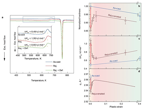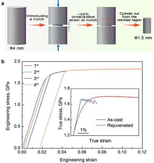 Collaboration research between Prof. Yi Li's group at the Shenyang National Laboratory of Materials Science, Institute of Metal Research, Chinese Academy of Sciences (IMR, CAS), and Prof. A.L. Greer's group at Cambridge University, UK, shows that plastic deformation under triaxial compression at room temperature can rejuvenate bulk MG samples sufficiently toenablestrain-hardening through a mechanism that has not been previously observed in the metallic state (DOI: 10.1038/s41586-020-2016-3).