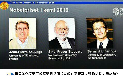 瑞典皇家科学院于当地时间10月5日宣布,将2016年诺贝尔化学奖授予让-皮埃尔•索维奇,J•弗雷泽•斯托达特和伯纳德•L•费林加三位科学家,以表彰他们掌握了在分子层面上控制运动的技术。