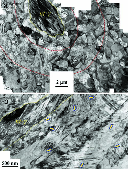 大量研究表明,很多钢铁材料在提高强度的同时往往会导致其塑性快速降低,即强度-塑性匹配表现为“香蕉型”倒置关系。如何改善这种强塑性关系是目前金属材料研究面临的一个重大科学难题。最近,我们通过动态塑性变形(DPD)技术结合退火热处理工艺,在粗晶奥氏体不锈钢中引入高密度的纳米孪晶晶粒,可以获得优异强塑性匹配的纳米孪晶强化奥氏体钢,其拉伸强度高达~1.0 GPa, 而均匀延伸率依然保持了~15%。显然,揭示这种新型纳米孪晶强化奥氏体钢的塑性变形机制对我们理解其力学性能至关重要。