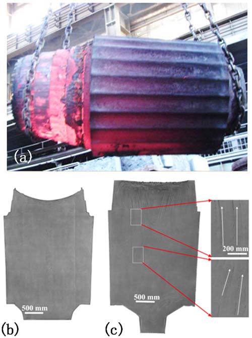 The 100-ton casting steel ingot and the fully sectioned and etched surfaces. (a) The as-cast ingot; (b) The sectioned surface of the ingot that was produced by VCD technique and vacuum pouring method. The total oxygen content is T.O=1.0×10-3wt.%. No channel segregation is visualized. (c) The sectioned surface of the ingot that was produced by AD technique and vacuum pouring method with T.O=1.5×10-3wt.%. A few slim channel segregations are observed as indicated by the white arrows.