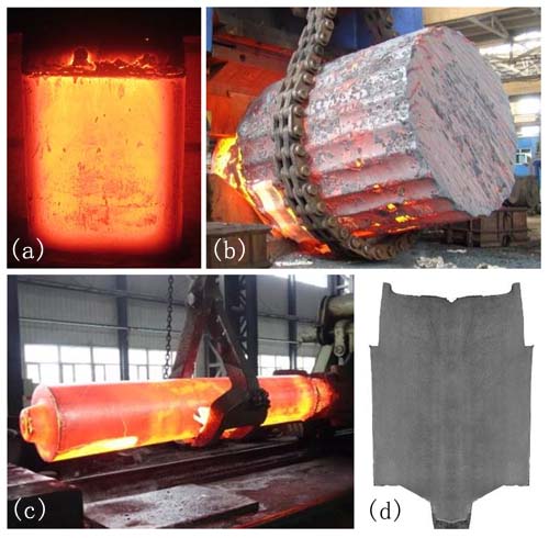 (a) 60t special slab (thickness 900mm, W:2.7m, H:3.6m).(b) 600t huge ingot (D:4.3m, H:7.6m). (c) High height/diameter cast slab (D:800mm, H:4.5m). (d) 100t high homogenized ingot (D:2.4m, H:3.6).