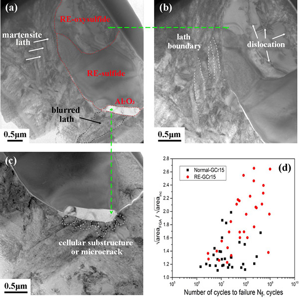 轴承是机械装备的核心零部件,接触疲劳破坏为其服役失效的主要形式。由于轴承的疲劳失效主要起源于非金属夹杂物,轴承钢中非金属夹杂物的优化控制至关重要。先进钢铁材料研究部自主开发了高纯稀土金属制备技术和高洁净轴承钢稀土处理技术,制订了轴承钢稀土处理生产工艺规范,显著细化、改性了钢中的夹杂物,突破了以往稀土处理存在的水口结瘤和性能波动的技术瓶颈,实现了高质量稀土轴承钢的稳定工业化生产。稀土处理能够变质轴承钢中存在的大尺寸夹杂物形成细小的稀土夹杂物,进而提升轴承钢的疲劳性能,其超高周拉压疲劳寿命延长10倍以上。在疲劳加载条件下,常规的氧化铝夹杂物附近组织中易于形成胞状亚结构和微裂纹,而硬脆性较低的稀土夹杂物能够协调基体的变形,缓解夹杂物与基体界面处的应力集中,迟滞基体中位错亚结构的演化和微裂纹的萌生。同时,小尺寸稀土夹杂物协调变形降低了裂纹扩展的驱动力,马氏体基体中位错演化和裂纹扩展通道形成缓慢,细晶区得以充分发展,从而抑制裂纹扩展,延长疲劳寿命。相关研究从微观组织演化和细晶区形成角度阐明了稀土轴承钢的超高周疲劳断裂行为及其疲劳性能改善的机制。