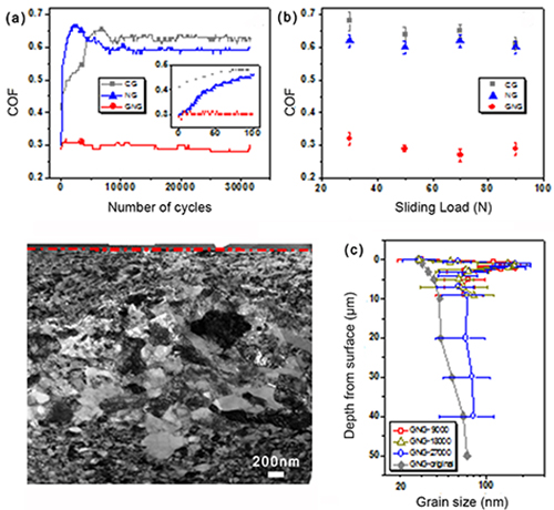 金属材料的干摩擦系数(通常处于0.6-1.2之间)普遍较高,其原因是摩擦过程中接触表面下方产生塑性变形,导致表面粗糙化以及形成易脱落的摩擦层。在工程应用中,降低金属零件之间的摩擦系数对提高其可靠性及效率尤为重要,但在技术上极具挑战性。纳米金属有限的塑性变形能力使其在摩擦过程中容易发生应变局域化,成为制约降低金属摩擦系数的瓶颈。