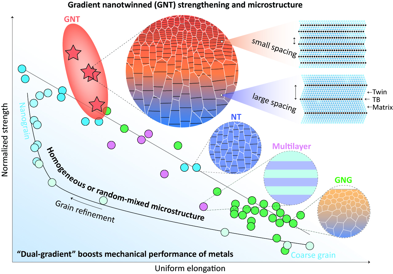 Fig.1: Highly tunable structural gradient for extra strengthening and ductility in metals. A gradient nanotwinned microstructure with a spatial gradient in both twin boundary (TB) spacing and grain size offers an unusual combination of strength, uniform elongation, and work hardening, which is superior to its strongest component and to existing heterogeneous strengthening approaches through gradient nanograined (GNG), homogeneous nanotwinned (NT), and multilayered microstructures.