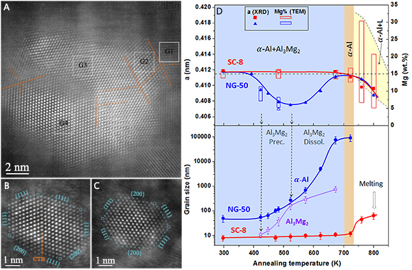 图1. (A-C) 受限晶体Al-Mg合金的结构;(D-E) 受限晶体的晶格常数、晶格中镁含量晶粒尺寸随退火温度图。