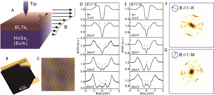 图1. (A) Bi2Te3\NbSe2超导异质结示意图;(B) 生长在NbSe2衬底上的高质量Bi2Te3薄膜形貌图;(C) Bi2Te3薄膜的原子分辨图;(D), (E) 在不同大小和方向的面内磁场作用下,隧道谱中来源于准粒子的信号逐渐增加;(F), (G) 准粒子干涉图案出现随磁场方向变化的分段费米面。