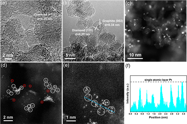 图1. (a)原始纳米金刚石和(b)ND@G的HRTEM图像,(c,d,e) 全暴露Pt团簇的HAADF-STEM图像,以及(f)其线强度分布图。