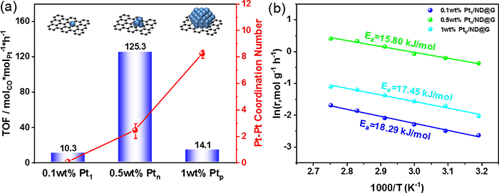 图2. (a)不同Pt/ND@G样品在30℃时的CO氧化性能图,和(b)表观活化能(Ea)。