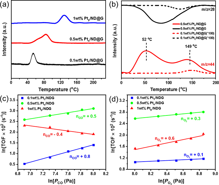 图3. (a)不同Pt/ND@G催化剂的CO-TPD图,(b) CO-TPSR图,(c)CO和(d)O2分压对不同Pt/ND@G上TOF的影响。