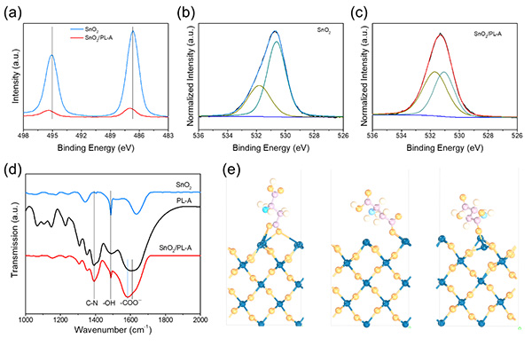 图1 PL-A处理SnO2薄膜的XPS图谱:(a)Sn 3d精细谱、(b)未处理薄膜O 1s精细谱、(c)PL-A处理后薄膜O 1s精细谱,(d)PL-A处理前(蓝线)后(红线)SnO2薄膜和纯相PL-A(黑线)的FTIR图谱,(e)PL-A在SnO2(010)晶面上的分布示意图,图中粉色、黄色、浅粉色、浅蓝色和蓝色原子分别代表C、H、O、N和Sn原子。