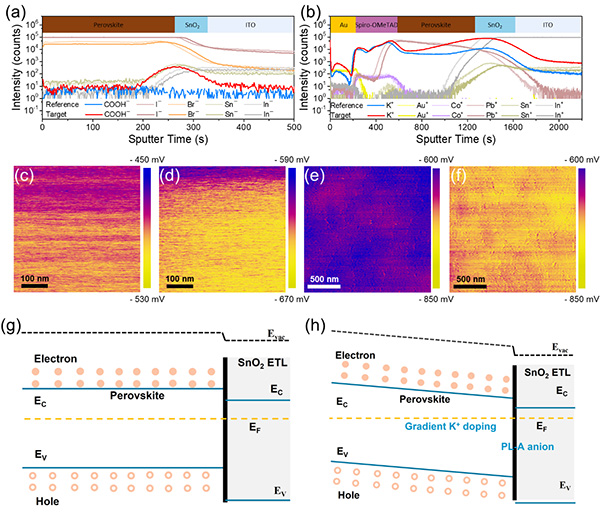 图2 (a)PL-A处理前(参比样品)和处理后(目标样品)ITO/SnO2/Perovskite复合结构的阴离子纵向分布曲线,(b)PL-A处理前后ITO/SnO2/perovskite/Spiro-OMeTAD/Au器件中的阳离子纵向分布曲线,PL-A处理前后SnO2以及钙钛矿表面的电势分布:(c)未处理SnO2薄膜、(d)PL-A处理后SnO2薄膜、(e)在未处理SnO2薄膜表面生长的钙钛矿薄膜、(f)在PL-A处理后SnO2薄膜表面生长的钙钛矿薄膜,PL-A处理前(g)和处理后(h)器件埋底界面能级结构示意图。