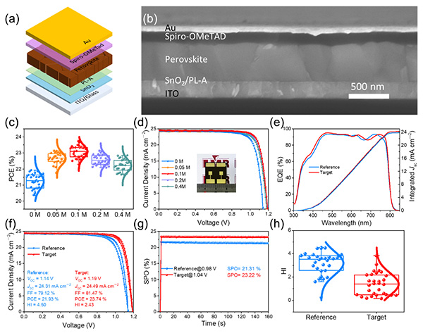 图3 钙钛矿太阳能电池器件的结构示意图(a)和SEM截面图像(b),利用不同浓度PL-A处理的器件能量转换效率统计结果(c)和最佳J-V曲线(d),PL-A处理前后最佳性能器件的IPCE曲线(e)、J-V曲线(f)、SPO曲线(g)和回滞因子HI统计结果(h)。