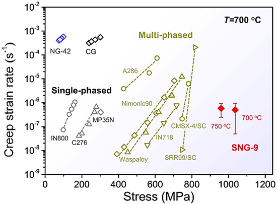 图2:具有弛豫晶界的纳米晶MP35N合金的蠕变性能,及其与其它牌号高温合金性能对比