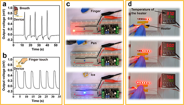 柔性温度-压力双参数传感器广泛应用于人体健康监测和智能机器人传感等领域,因而受到了广泛关注。然而,目前柔性温度-压力传感器基本都采用两种独立的传感材料实现双参数传感功能,这不仅提高了传感器的设计-集成难度,也增加了制造成本。因此,研发具有多功能一体化的先进传感材料成为本领域的研究重点和难点问题。碲化铋是一种能将热能直接转换为电能的半导体材料,其产生的电压与施加在材料两端的温差成正比关系,可用于温度传感;同时,该类材料在受到应力作用时,带隙会发生明显改变,表现出压阻效应,从而还可以实现压力传感。但碲化铋半导体具有本征的刚性和脆性,力学和加工性能较差,难以弯曲变形、精密加工和高密度集成器件。