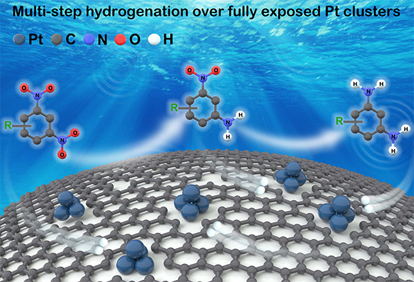 最近,中国科学院金属研究所沈阳材料科学国家研究中心刘洪阳研究员、刁江勇副研究员和博士研究生司阳等人与北京大学马丁教授、中国科学院山西煤化所温晓东研究员、香港科技大学王宁教授等团队合作,在富缺陷石墨烯载体表面精准构建了全暴露Ptn团簇催化剂,实现其高效催化2,4-二硝基甲苯多步加氢,并在亚纳米尺度下系统理解2,4-二硝基甲苯加氢的金属结构的依赖性。近日,该研究成果在《自然-通讯》 (Nature Communications) 在线发表。(论文链接:https://doi.org/10.1038/s41467-024-49083-6)