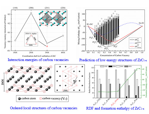 相关工作发现了过渡金属碳化物中具有普适性的碳空位构型有序化自组装驱动机制,预测了实验可能获得的亚计量比ZrC1-x有序相,为理解碳空位的容纳机制及实现力学和热学性能的优化调控提供了思路。相关研究结果发表在Journal of the American Ceramic Society97, 4024–4030 (2014);Scientific Reports5, 14192 (2015);Scientific Reports5, 18098 (2015)和Acta Materialia111, 232–241 (2016)等期刊。研究工作得到了沈阳材料科学国家(联合)实验室顶层导向研究项目的支持。
