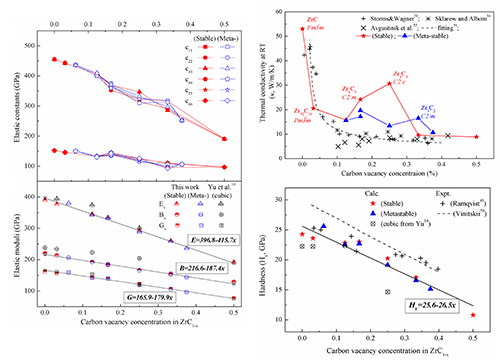理论预测还表明碳空位有序化对亚化学计量比过渡金属碳化物的力学性能和晶格热导率及相稳定性有重要影响。随空位浓度升高,ZrC1-x的弹性刚度和维氏硬度近线性降低,呈现软化趋势;但是空位构型不同对刚性和硬度的影响较弱。与之相比,晶格热导率对碳空位浓度和碳空位构型都非常敏感,即使只有少量碳空位,其热导率也会急剧下降,机制是碳空位显著改变声学支声子的德拜频率(或声子的平均声速),从而影响Umklapp三声子散射占主导的传热过程。