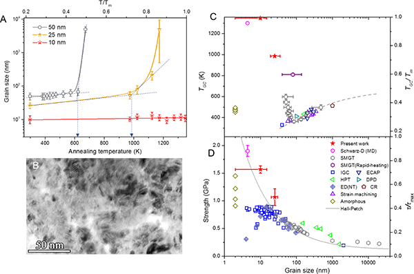 图2 A 晶粒尺寸分别为10nm,25nm,50nm的纯铜晶粒尺寸随退火温度的变化情况;B 纯铜受限晶体加热到接近熔点温度(1348K)晶粒尺寸没有明显变化;C 和D分别为纯铜中晶粒粗化温度与强度随晶粒尺寸的变化图,受限晶体呈现出接近熔点的超高稳定性和接近理想强度的高强度。