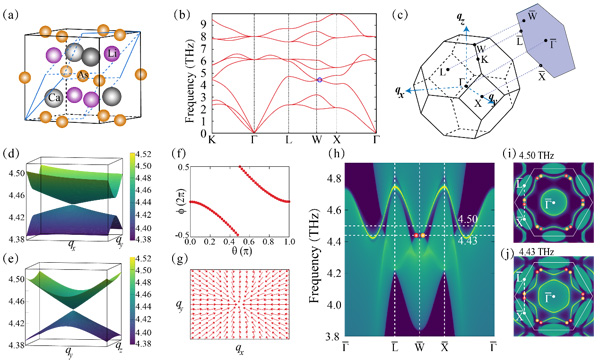 图2 在半Huseler合金LiCaAs家族材料中揭示的在声学支顶点与光学支最低点接触处存在的拓扑单外尔声子及其表面态