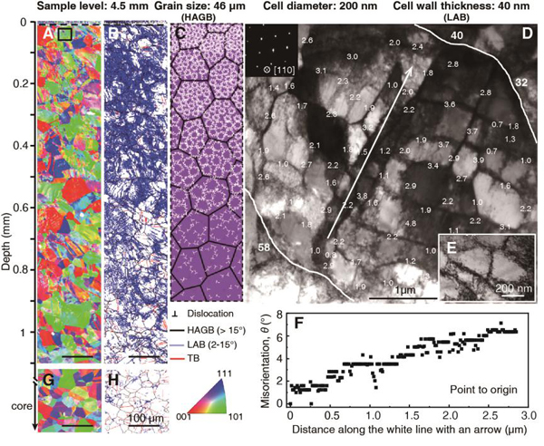 图1 Al0.1CoCrFeNi高熵合金中典型梯度位错结构。距离样品表面1.2 mm内(A, B)以及芯部(G, H)的截面EBSD结果显示晶粒 (形貌、尺寸、取向)以及内部位错结构在空间上的分布特征;(C) 梯度位错胞结构示意图;(D-E) 表层晶粒内典型位错胞TEM结果显示平均位错胞尺寸为200 nm,胞壁取向差介于0.7o -4.8o;(F) 对应D图单个晶粒内跨过诸多位错胞的累积取向差仅为7o。