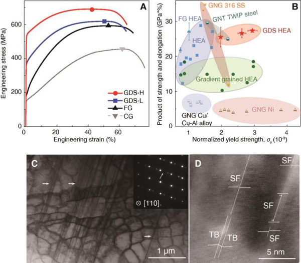 图2 梯度位错结构Al0.1CoCrFeNi高熵合金的力学性能和变形机制。(A) 拉伸工程应力-应变曲线;(B) 强塑积与归一化屈服强度曲线,表明梯度位错结构高熵合金的综合力学性能优于相同成分的其它均匀结构和梯度结构,同时也优于文献中其它梯度纳米晶和梯度纳米孪晶结构金属和合金;(C-D) 拉伸应变为3%时典型变形结构的HAADF-STEM结果表明梯度位错结构的塑性变形通过独特的超高密度亚十纳米层错和少量孪晶界协调。