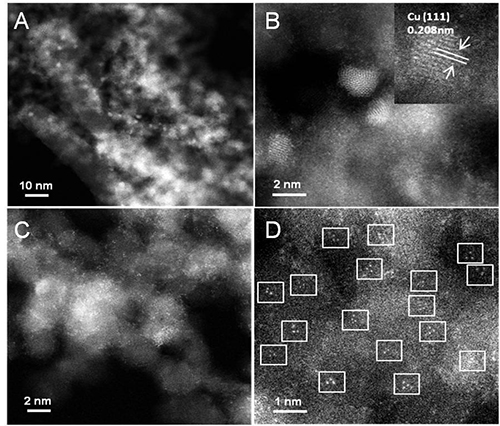 图1. (A),(B) Cu纳米粒子(Cu-NPs/ND@G) 的球差电镜表征;©,(D) 亚纳米尺度Cu3金属团簇(Cu3/ND@G)的球差电镜表征。