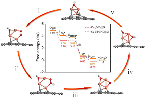 图2. Cu3/ND@G各种中间体沿模拟氧化酶反应路径的优化吸附构型和Cu3/ND@G、Cu-NPs/ND@G模拟氧化酶机理的自由能图。灰色、棕色、红色和白色的球分别代表C、Cu、O和H原子。