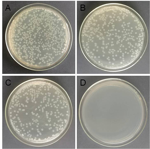 图3. 生长抑制试验:将不同的材料和大肠杆菌菌液孵育后涂在LB琼脂平板上。用(A)空白、(B) ND@G、© Cu-NPs/ND@G和(D) Cu3/ND@G处理。培养条件:37℃和24小时。