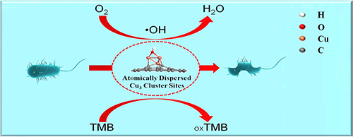 随着现代社会的不断进步与发展,越来越多的病菌也随之出现,并严重的威胁着人类的健康。大量抗生素和药物的广泛使用使一些病菌产生了耐药性,所以寻找新型抗菌材料刻不容缓。氧化应激作用是灭杀细菌的一种有效方法,通过活性氧物质作用于细菌,破坏细菌细胞内部的新陈代谢,导致细菌失活。纳米酶是一类具有模拟酶催化活性的纳米材料,其因强大多样的酶催化活性而备受关注。研究发现一些纳米酶具有模拟氧化酶、过氧化物酶等催化活性,其产生的活性氧物质可以有效的灭活细菌。目前,在构建具有优异模拟酶催化活性的新型纳米酶方面仍然存在挑战。近年来,单原子金属纳米酶的发现引起了人们的极大关注。原子级分散的金属活性位点最大化实现金属原子的利用率,且可以精确设计和控制孤立金属原子的配位结构,这有助于理解纳米酶的结构-性能关系。然而,由于在一些反应中缺少邻近位点,单原子金属催化剂可能会遇到催化效率低和催化剂烧结等问题。与单原子催化剂相比,亚纳米尺度原子级分散且完全暴露的金属团簇催化剂不仅能提供相邻的金属原子作为催化位点,而且能保持充分的原子利用效率,提供了多种结构可能性和催化可行性。将这种原子级分散且完全暴露的金属团簇催化剂应用于抗菌领域,可以有效的提升抗菌性能保护人们的健康。