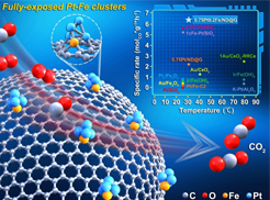 最近,沈阳材料科学国家研究中心刘洪阳研究员和博士研究生贾志民等人与北京大学马丁教授、香港科技大学王宁教授、中科院上海应用物理所姜政研究员以及中科院山西煤化所温晓东研究员等团队合作,设计出一种锚定在弯曲石墨烯载体(ND@G)上的新型PtFe双金属团簇催化剂(0.75Pt0.2Fe/ND@G),该催化剂由少数几个Pt原子与邻近Fe原子键合形成原子级分散全暴露PtFe双金属团簇,可以实现低温下高效去除氢气中的CO,并保持100%的CO选择性。这种全暴露PtFe双金属团簇具有最大化的金属利用率和丰富的Pt-Fe界面活性位点,是目前已报道的具有最高低温活性速率的催化剂。